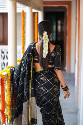 Make a stunning statement this Navratri with Poridheo’s Black Pure Cotton Saree » with Weaving Work, designed to keep you stylish and comfortable all night long. Crafted from premium pure cotton, this saree offers a soft and breathable texture, ideal for the energy and excitement of Garba nights. The elegant black shade combined with intricate weaving work adds a touch of sophistication and festive charm. Whether you’re dancing to the beats of dandiya or attending evening rituals, this saree ensures you move gracefully while looking effortlessly beautiful. Shine under the Navratri lights with Poridheo’s Black Pure Cotton Saree with Weaving Work.